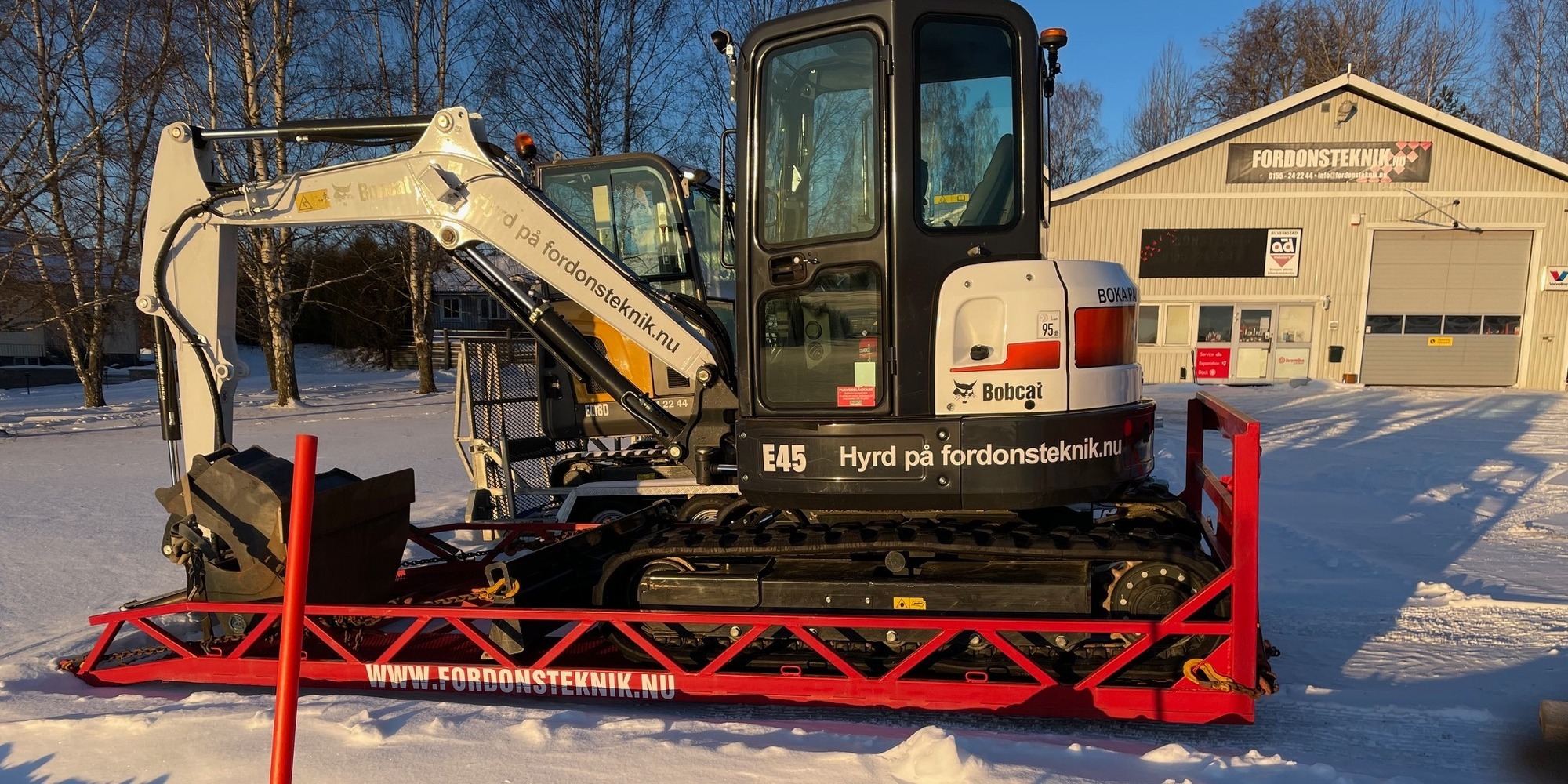 I hyran ingår skopa och transportsläp för maskin.